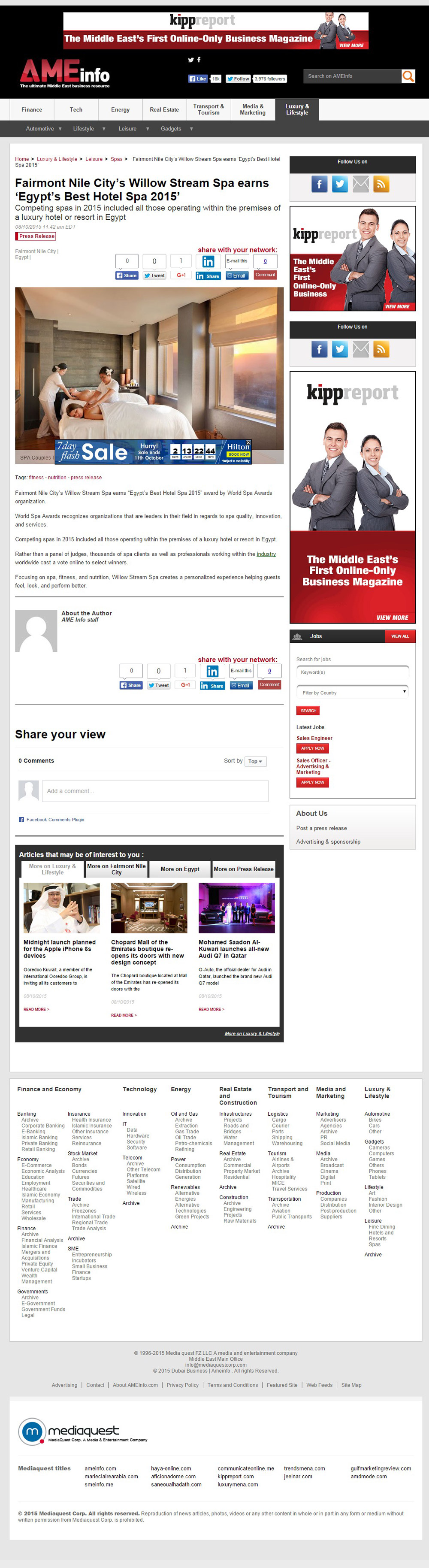 AMEInfo: Fairmont Nile City's Willow Stream Spa earns "Egypt's Best Hotel Spa 2015"